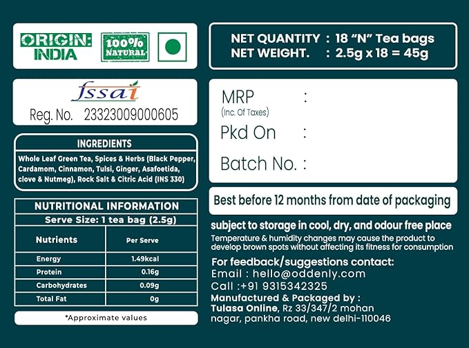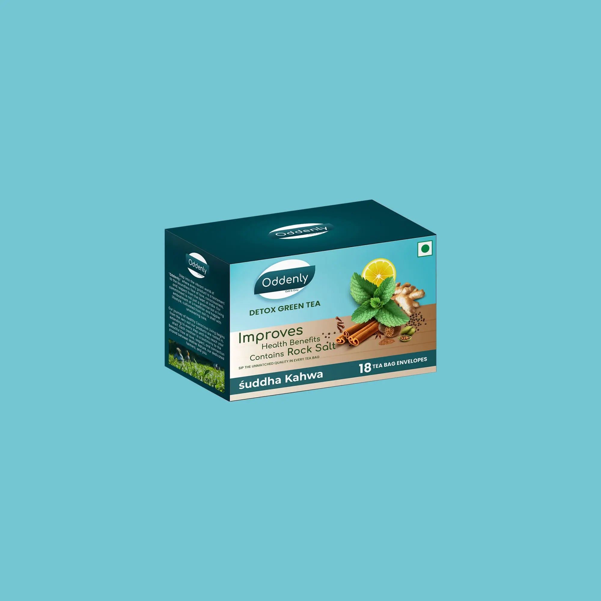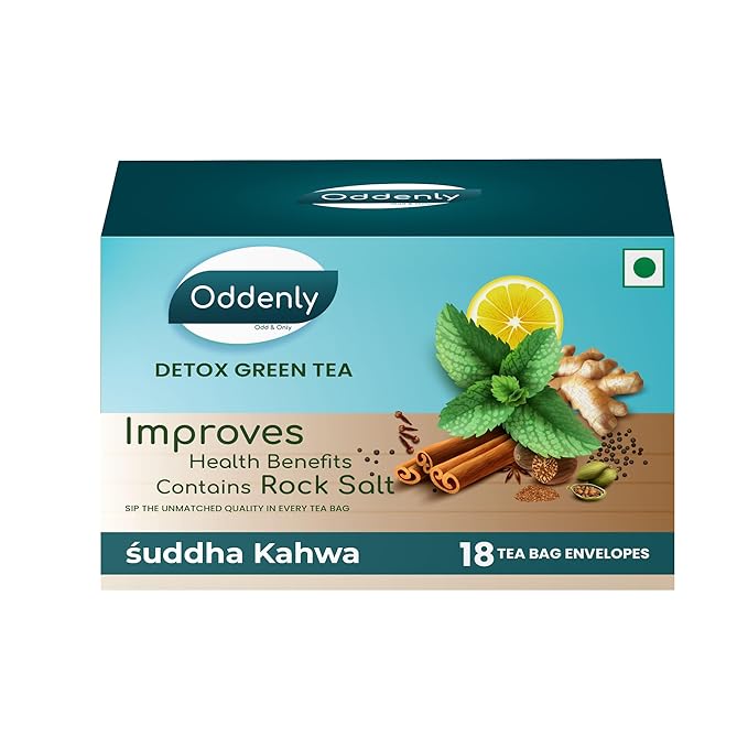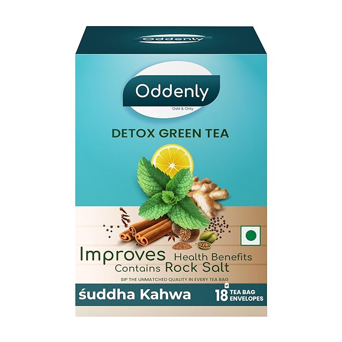 Immerse yourself in the rejuvenating blend of Oddenly Kahwa Tea, a detoxifying green tea infused with a unique array of ingredients including Black Pepper, Ginger, Tulsi, Asafoetida, Clove, Cardamom, Cinnamon, Nutmeg, Rock Salt, and Citric Acid. Experience the aromatic warmth of black pepper and ginger, coupled with the herbal richness of tulsi and the subtle sweetness of clove and cardamom. This detox green tea offers a flavorful and invigorating experience, harnessing the natural benefits of its ingredients to promote wellness and vitality. Indulge in a soothing infusion that not only tantalizes the taste buds but also supports your body’s detoxification process, making it the perfect choice for those seeking a cleansing and refreshing tea blend. Elevate your tea ritual with the distinctive flavors and detoxifying qualities of Oddenly Kahwa Tea, crafted to rejuvenate both body and spirit.