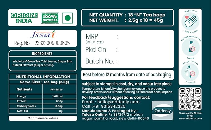 Immerse yourself in the revitalizing fusion of Oddenly Green Tea Bags, infused with the invigorating blend of Tulsi and Ginger flavors. Experience the natural synergy of green tea’s freshness heightened by the herbal warmth of tulsi and the spicy kick of ginger. These tea bags offer a convenient way to enjoy a harmonious balance of wellness and flavor. Embrace the aromatic blend that not only tantalizes your senses but also provides a revitalizing and energizing tea experience. Discover the perfect harmony of Tulsi and Ginger in every tea bag, offering a unique and comforting infusion that elevates your tea ritual.